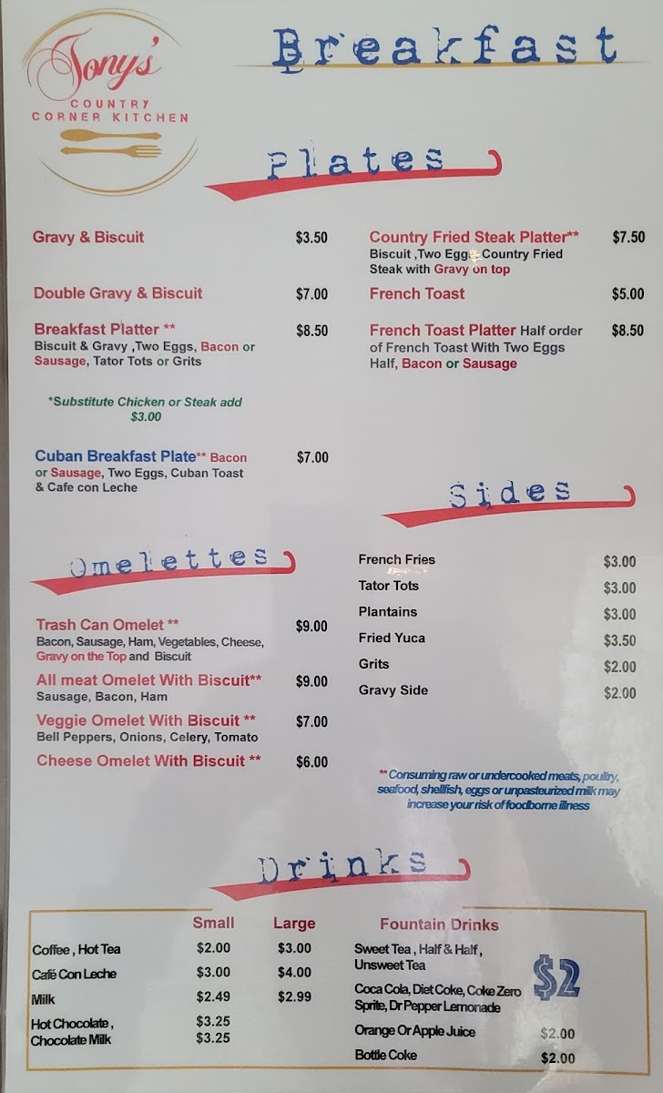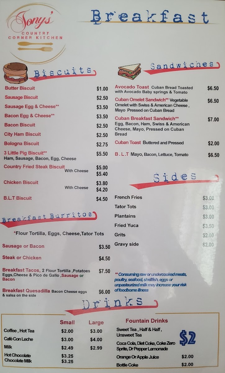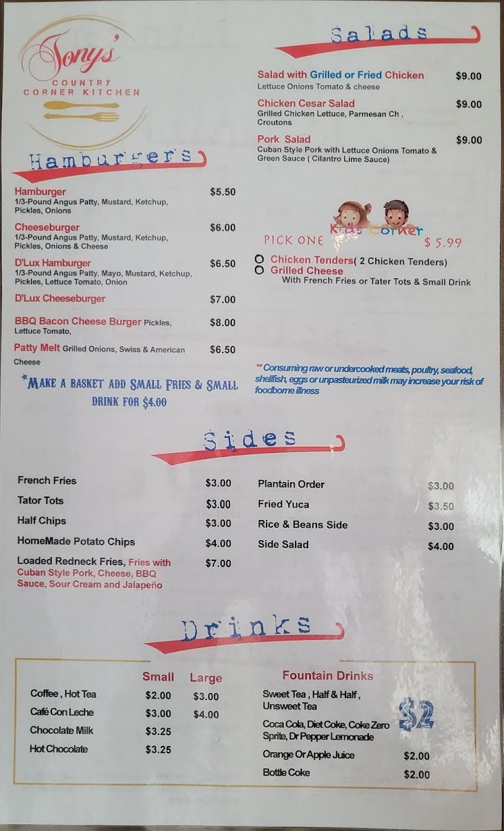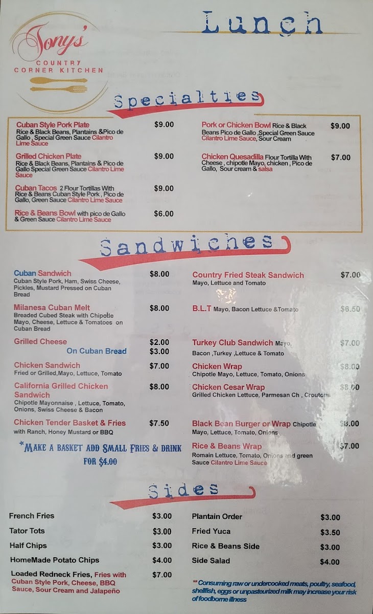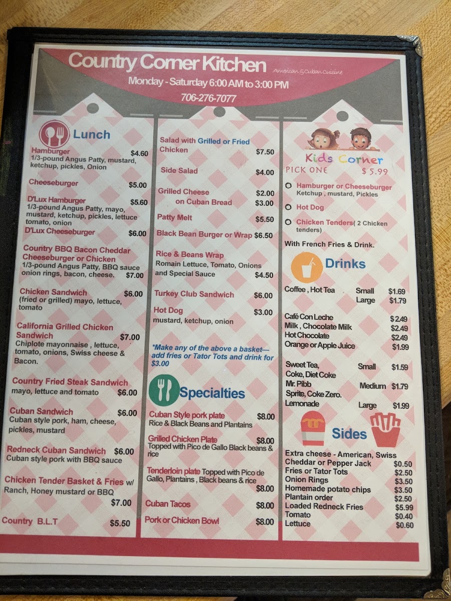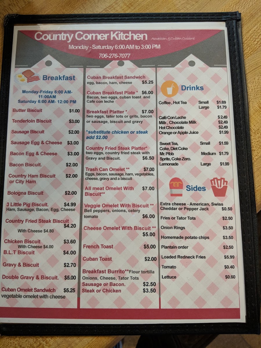 Welcome to The Country Corner Kitchen, where comfort food meets homestyle charm! Nestled at 2020 Old Hwy 5 S in Ellijay, GA, our menu is a delightful array of hearty dishes crafted to satisfy your cravings any time of day. Start your morning off right with our Breakfast Platter or indulge in our mouthwatering French Toast paired with crispy bacon. For lunch or dinner, don't miss our famous Fish Tacos, Great Cuban Sandwich, or the unforgettable Cuban Pork Plate. Each dish, from the rich Gravy and Biscuits to the savory Patty Melt and the decadent Redneck Loaded Fries, is prepared with love and care. Whether you’re in the mood for breakfast favorites like our Breakfast Chicken Burrito or the comfort of Shrimp & Grits for a relaxing evening meal, our selection promises to please every palate. We invite you to gather around our table and experience the delicious specialties that keep our guests coming back for more!